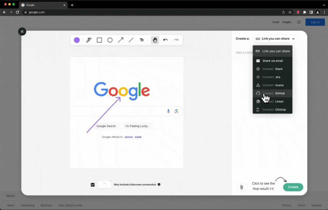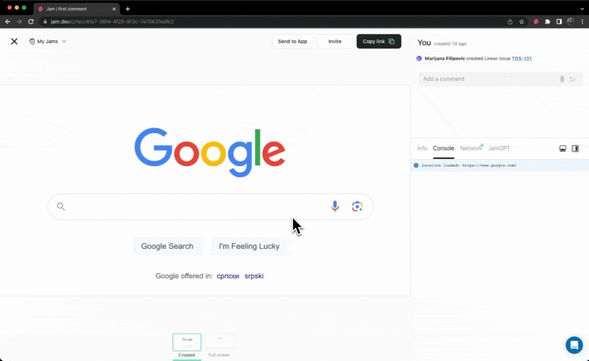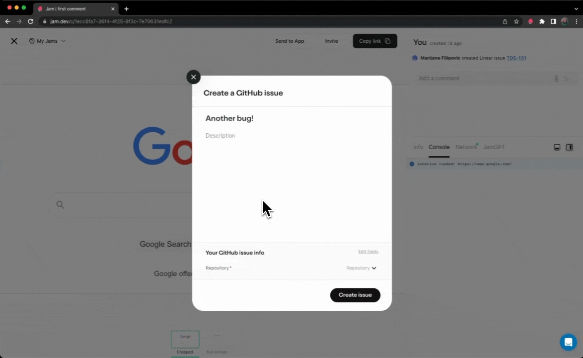 You can connect GitHub and Jam in order to instantly create GitHub issues right from Jam's browser extension. Every GitHub issue you create with Jam automatically includes: