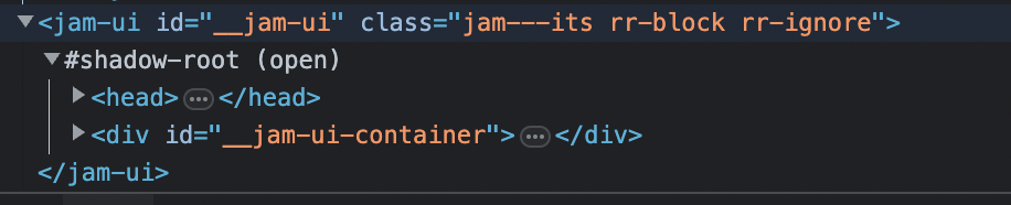 We started with tracing the code. The extension UI is built on top of React and is anchored to a shadow DOM element. When every browser tab loads a page, we inject a script for the Jam UI. This inserts a <jam-ui> tag and mounts shadow DOM underneath it via .attachShadow.
