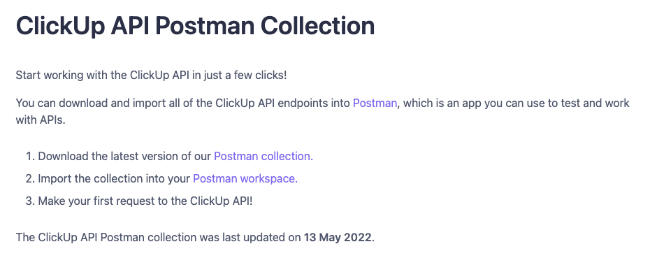 Additionally, you can download all the ClickUp API endpoints into Postman which makes it super easy and fast to test the API endpoints even before you start writing code.