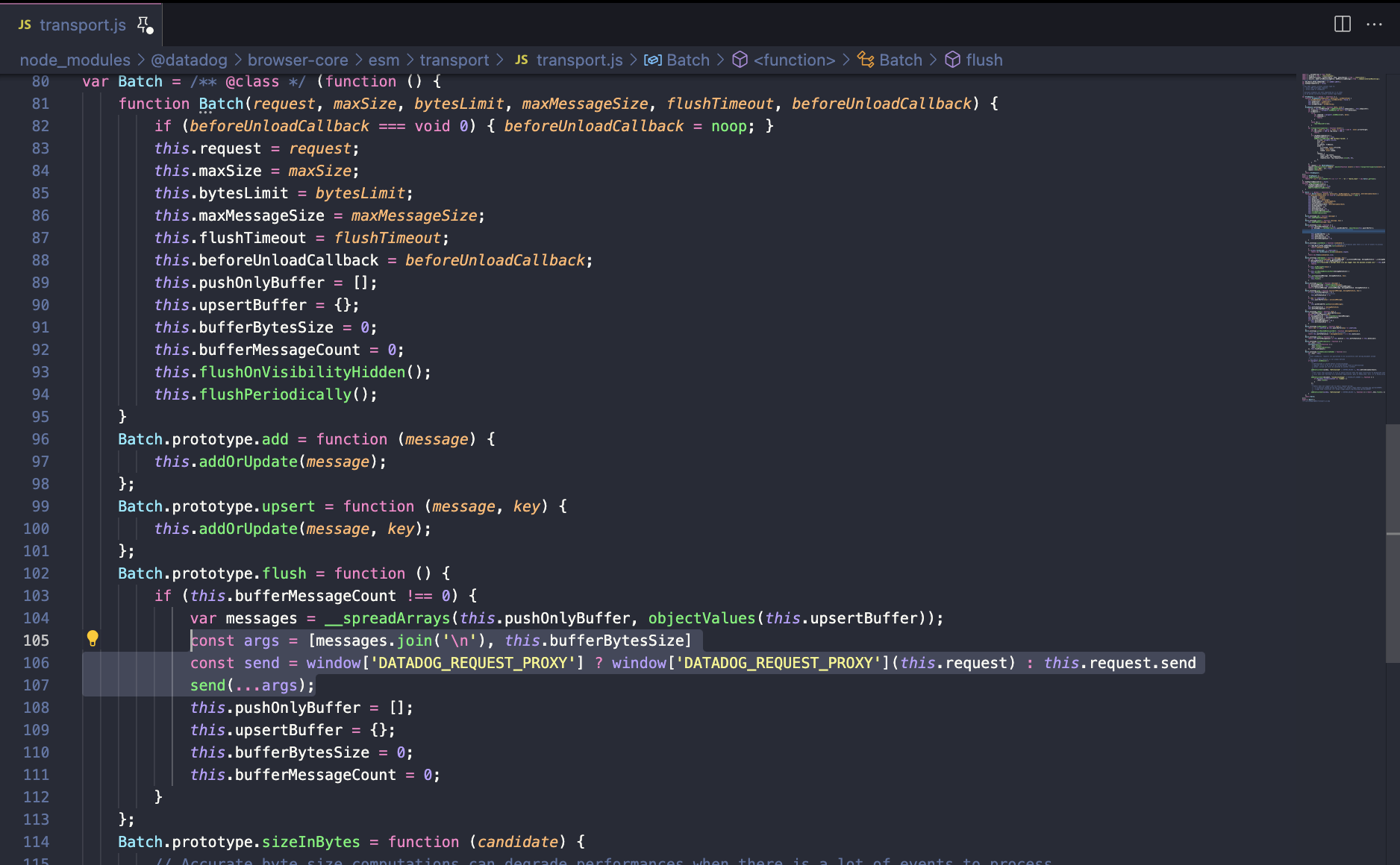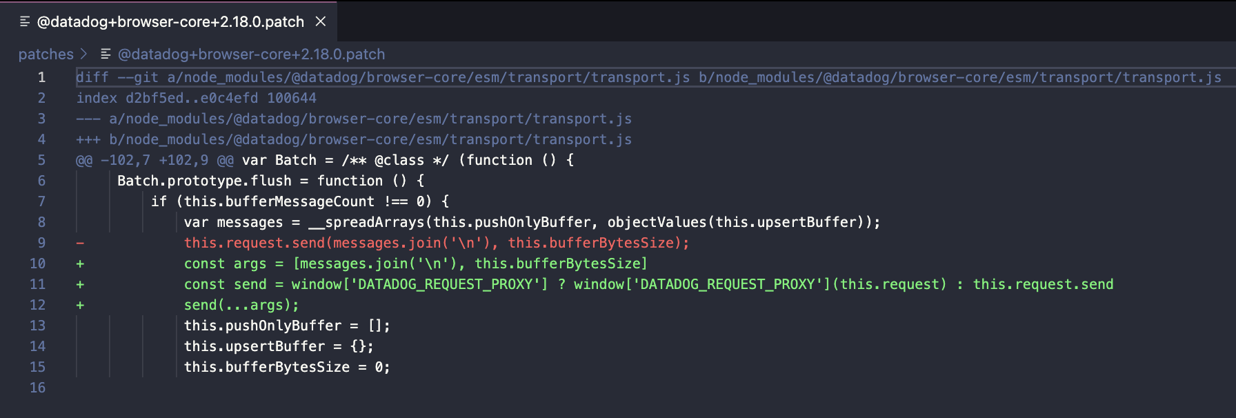 @datadog/browser-core, which is the package I patched directly, after elevating it to a top-level dependency.What we need to do now is modify this file to allow us to proxy these requests. After that, we'll be able to proxy these requests over postMessage, from our content script to our background script.