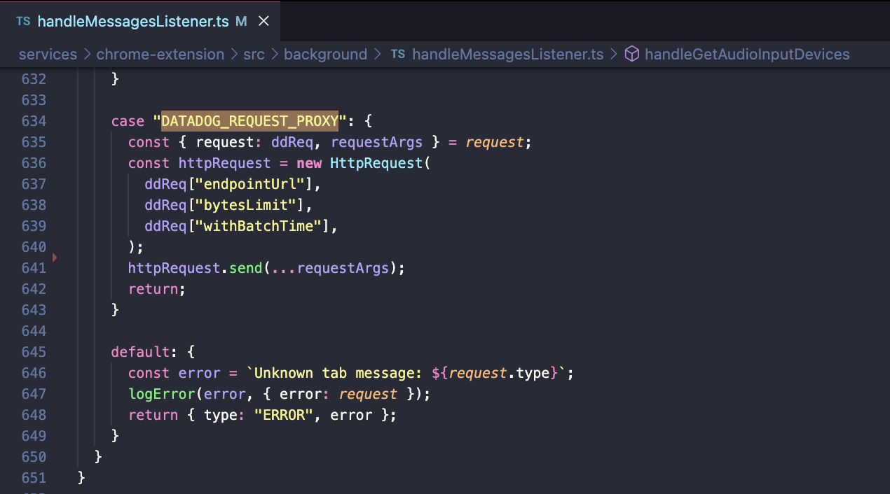 'DATADOG_REQUEST_PROXY' function to the window, our logger falls back gracefully. This is useful, because we'll be using this dependency in our background script as well, where we want to use default behavior!Amazing! Last step, proxy the messages and execute them on the background script.