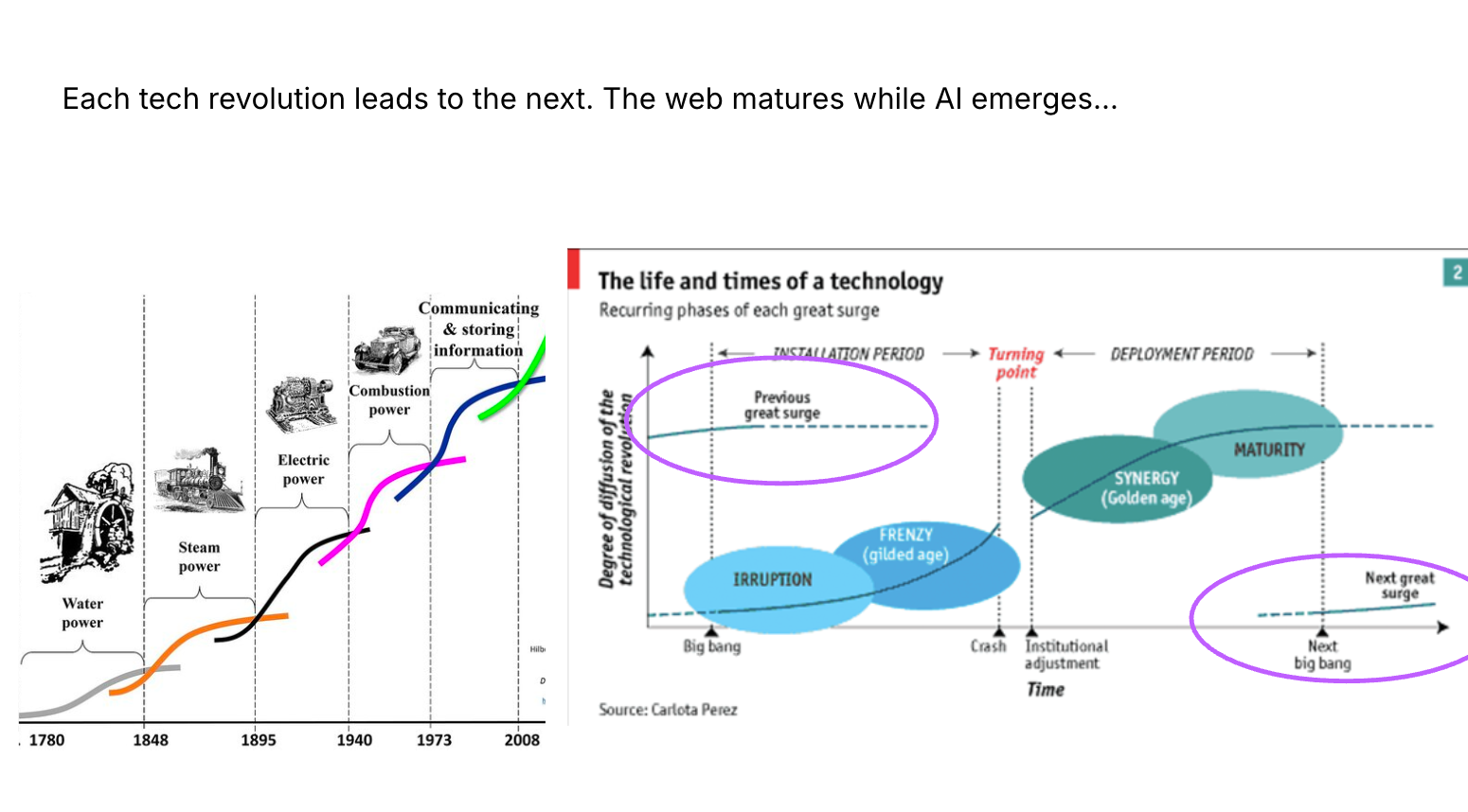 But economist Carlota Perez comes out with a book that year saying: actually the web is not over, it’s just getting started. And over the next 25 years, the web is fundamentally going to change every part of the fabric of our society.