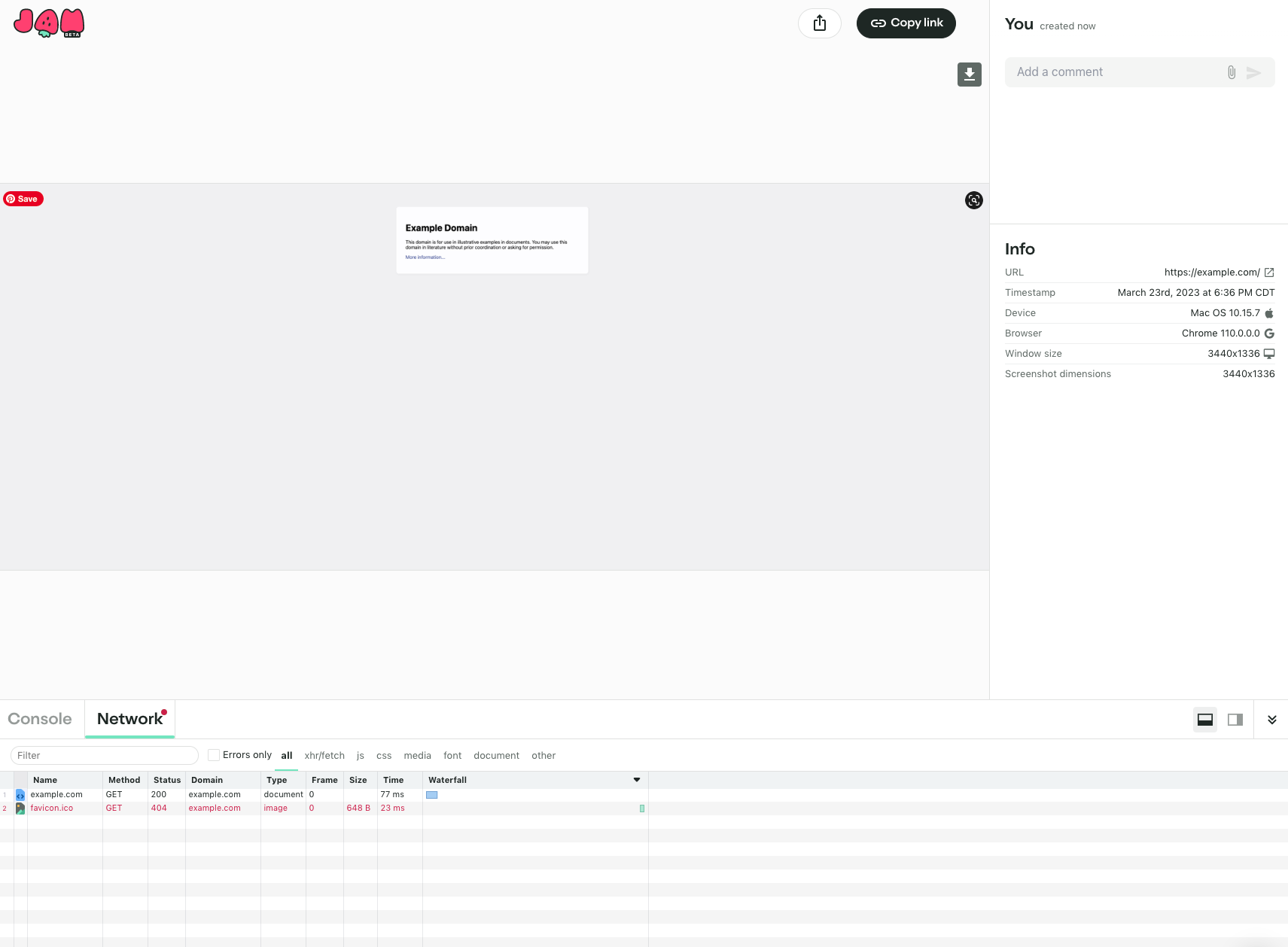 After you hit 'Create', Jam will create a link for you with the screenshot, device information, console logs, and network requests.