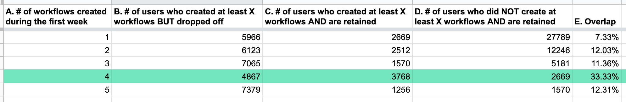 The “at least” part is important here. This means a retained user who created at least 5 workflows during their first week will be included in all the rows for column C.