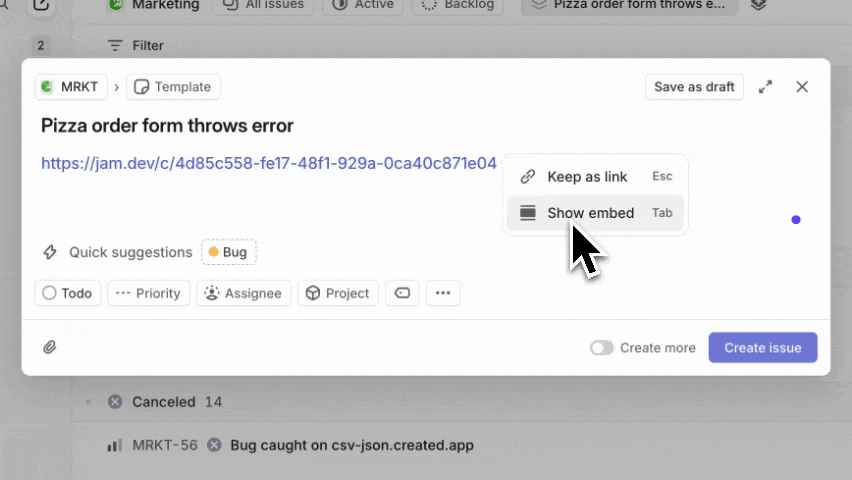 Paste a Jam link in a Linear ticket or comment, and engineers can see the embedded video with network and console errors right there.