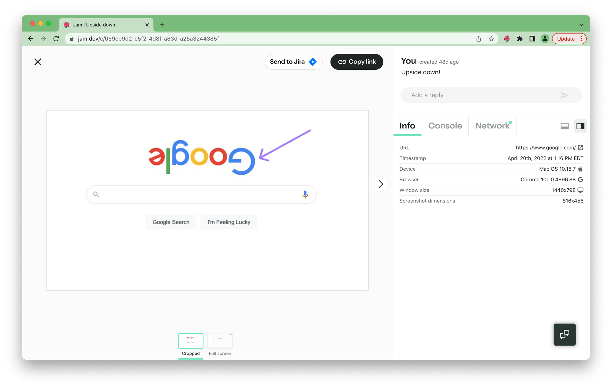 That's where a bug tracking tool like Jam comes in. Jam is a Chrome extension that testers can use to take a screenshot, record a video, or share a rewind of a bug that just happened. It's the fastest way to capture and send bugs to any tracking tool like Jira or a Slack channel during a bug bash.