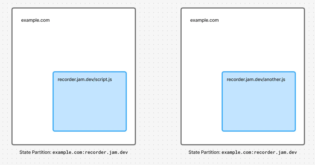 recorder.example.com is same-domain but not same-origin to example.comOur next idea was to bring our contents to your origin, by embedding both the Capture and the Recorder scripts onto your pages via iframe. This way, both capture.js and recorder.js scripts would live in the example.com:recorder.jam.dev partition, and could communicate to each other!