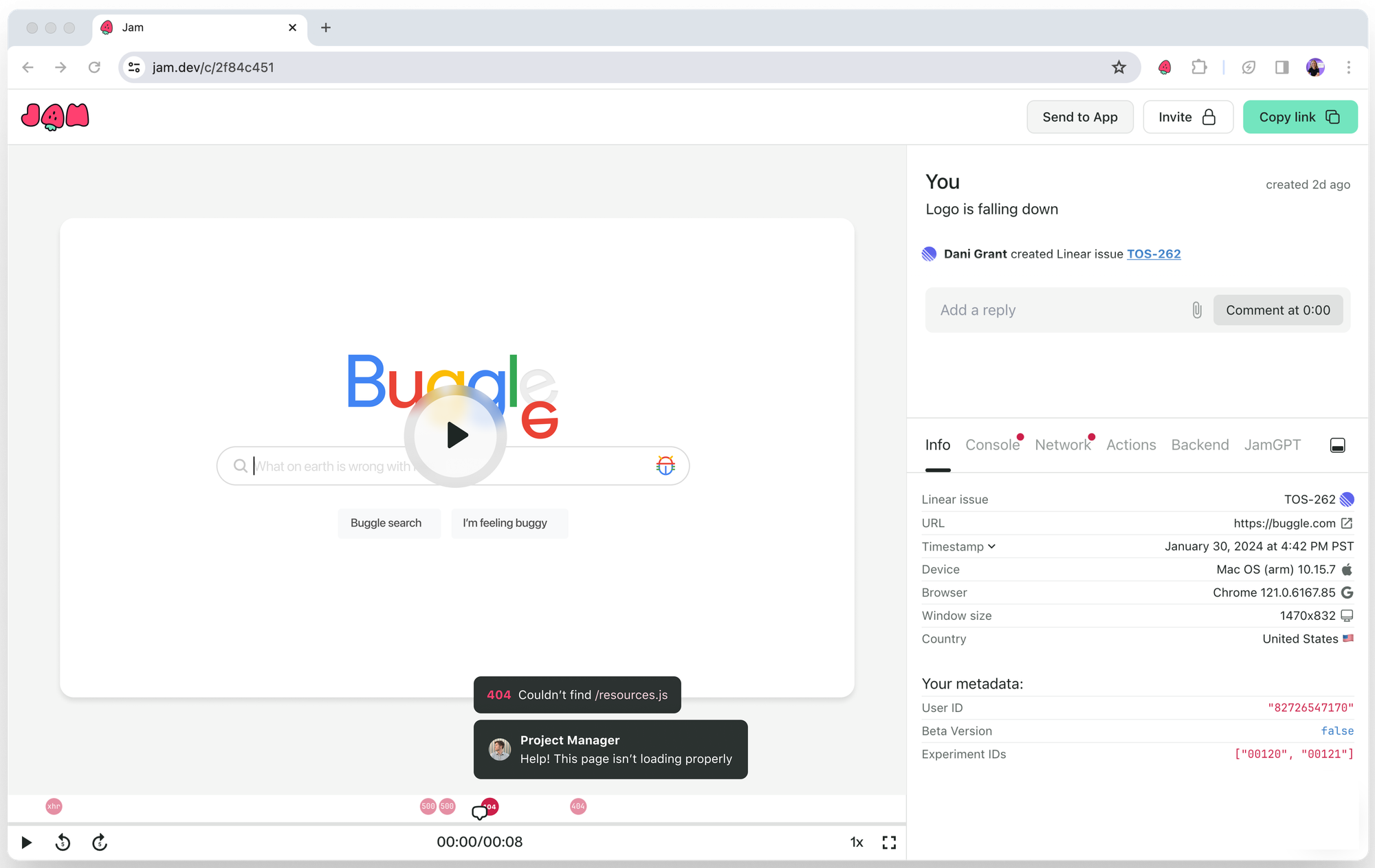 | Functional | Features or functions that don't work as expected. | Broken links, unresponsive buttons, form errors. | Include expected vs. actual results. Use Jam's video capture to show the issue w/ automatic repro steps. |