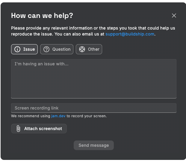 Today, BuildShip users send Jams for a variety of reasons, beyond flagging issues. Their in-product support box has a unique field for Jam links. So, whether users are requesting help, a new feature, providing feedback, or reporting a bug… with Jam, the engineers on the other side have all the context they need to fix, ship, and build for their users.